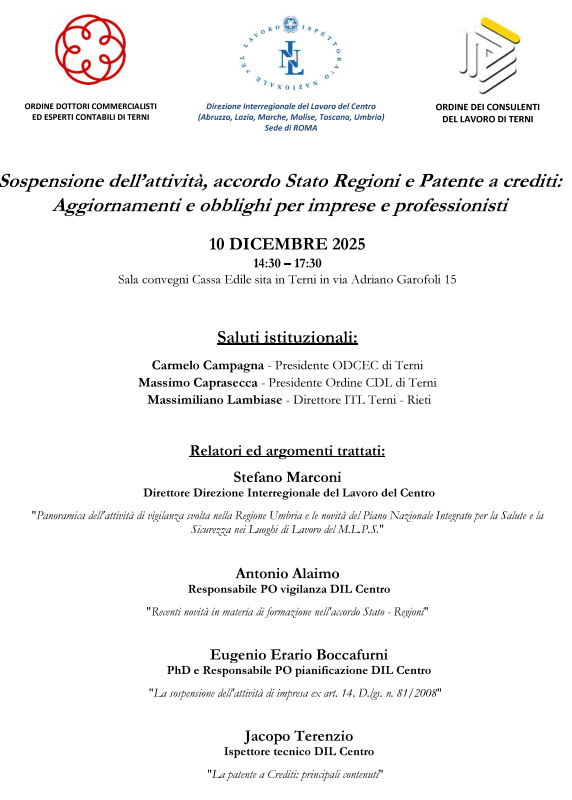La DIL Centro ha partecipato, lo scorso 10 dicembre scorso, a un seminario di approfondimento - organizzato dagli Ordini dei Commercialisti e dei Consulenti del Lavoro di Terni - dal titolo “Sospensione dell’attività, accordo Stato - Regioni e patente a crediti: aggiornamenti ed obblighi per imprese e professionisti”.